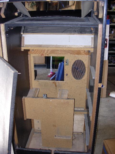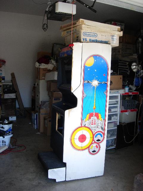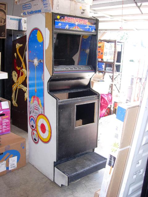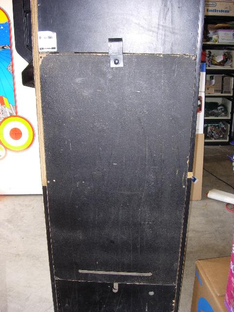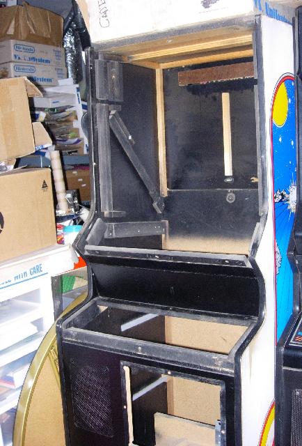 cabinet is solid. Some of the pictures were taken before I removed the open face bezel and the monitor shelf. These are not included with the cabinet. Without the monitor shelf there, you could mont the monitor in the original way if you had the parts from the periscope version. I need this out by the beginning of June, or it will unfortunately have to go to the dump. I am moving, and don't have room to store this, as much as I hate dumping games. Come on, come get it, the price is right - FREE! Use this for your Battlezone restoration project, or convert to a different game, or some other creative ideas (TV stand, perhaps?). Go back to my main page by clicking here. |